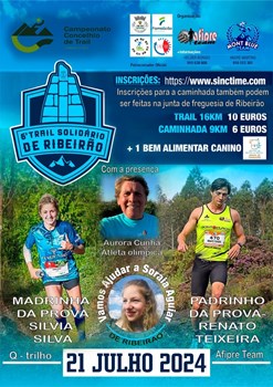O 6º Trail solidário de Ribeirão pretende promover a prática desportiva e dar a conhecer os trilhos da vila de Ribeirão - V. N. Famalicão, com um novo trajeto para descobrires Em 2024 aliamos novamente o evento a várias causas solidárias. A verba resultante das inscrições da caminhada revertem a favor da soraia aguiar aos 3 anos fui diagnosticada com um atraso de desenvolvimento global, com alguns exames verificamos hipoplasia do vermis (parte cerebral) que dificulta todo o tipo de aprendizagem. As racões para os animais resultantes de cada inscrição vão ser doados ao centro de recolha animal de Vila Nova de Famalicão. Contamos com a tua presença e assim juntares o desporto á solidariedade no que vai ser um dia de plena atividade física, de convívio e festa.