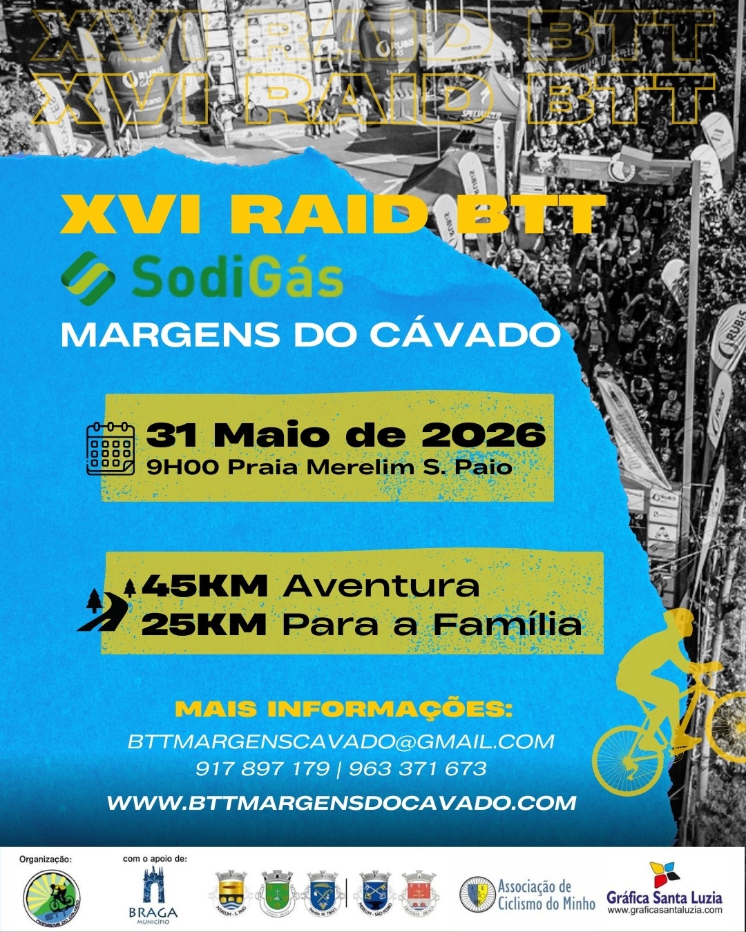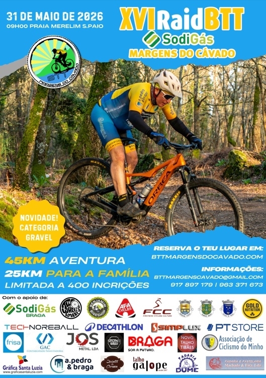 Temos para vos oferecer, além do Raid BTT MC de +/- 45km, com duas provas pontuáveis, BTT e Gravel, o Passeio BTT MC em família de +/- 25 km. Um excelente percurso diversificado e repleto de magníficas paisagens, do topo da montanha ao espelho das águas do Rio Cávado, pedalando por trilhos florestais e caminhos rurais de algumas freguesias dos concelhos de Braga, Vila Verde, Ponte de Lima e de Barcelos.
